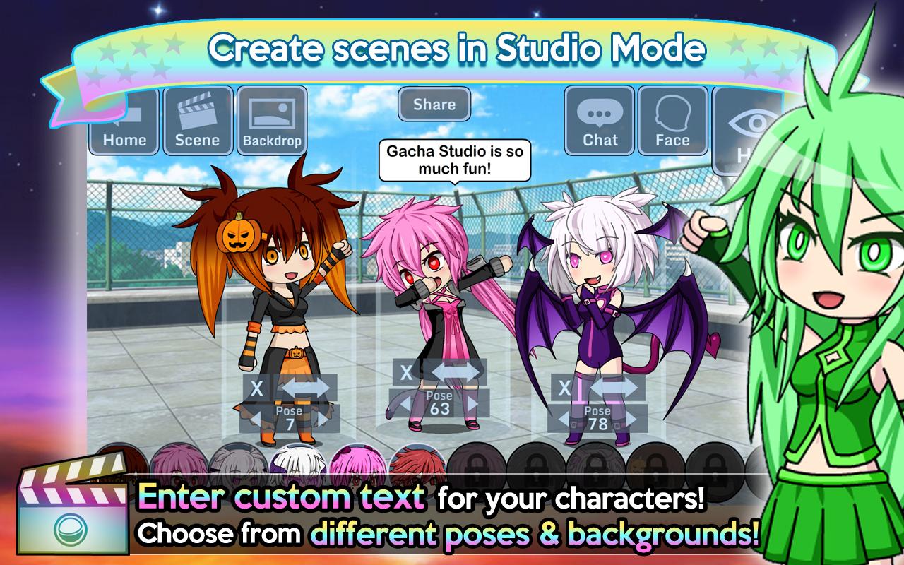 The ultimate Anime Dress-Up app! Create your own anime styled characters and dress them up in your favorite fashion outfits! Boys and girls can choose from hundreds of dresses, shirts, hairstyles, hats, and much more! After designing your characters, enter the Studio and create any scene you can imagine! Strike up your favorite pose and add text bubbles with your own messages! Choose from over a hundred backgrounds to create the perfect scene! For even more fun, collect and gacha rare pets and train them in the Arena! Enter the Gacha Studio today! Lights, camera, action!